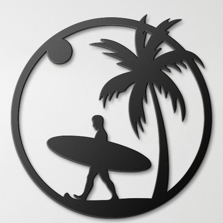 Bring the laid-back energy of the beach to your space with our Coastal Surfer Paradise Metal Wall Art. This striking design features a surfer walking along the shore, surfboard in hand, framed by a majestic palm tree and a glowing sun. Whether you're a wave rider or simply drawn to the serenity of coastal living, this handcrafted metal piece is the perfect statement for your home, patio, or beach retreat.