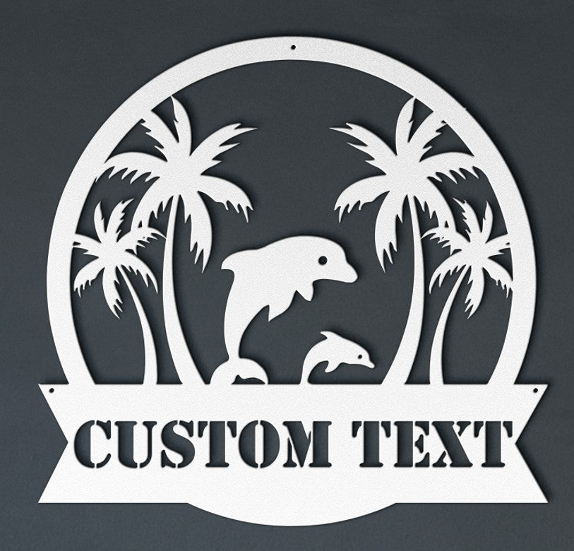 Transform your space with the beauty of the ocean! This Custom Dolphin Scene Metal Sign features a beautifully detailed dolphin duo jumping among tropical palm trees, enclosed in a circular frame with a custom text banner below. Whether for your beach house, vacation rental, or coastal retreat, this personalized sign adds a unique and elegant touch to any setting.