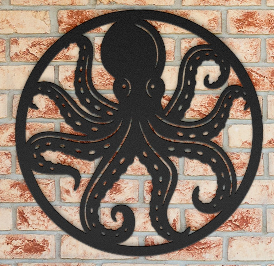Embrace the grace and intrigue of the ocean with this Octopus Metal Wall Art. Featuring an intricately designed octopus surrounded by a circular frame, this piece captures the intelligence and fluid movement of this fascinating sea creature. Whether you're decorating a beach house, coastal-themed room, or nautical-inspired space, this striking metal sign makes a bold and sophisticated statement.