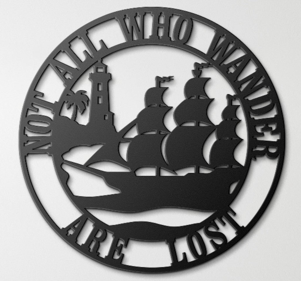 Capture the spirit of exploration and adventure with this Tall Ship Metal Wall Art featuring the iconic phrase "Not All Who Wander Are Lost." This intricately designed steel wall sign showcases a majestic sailing ship, a lighthouse, and a tropical island, symbolizing the thrill of the open sea and the freedom of wandering. Whether you're a sailor, traveler, or simply drawn to maritime history, this piece makes an inspiring and bold statement.