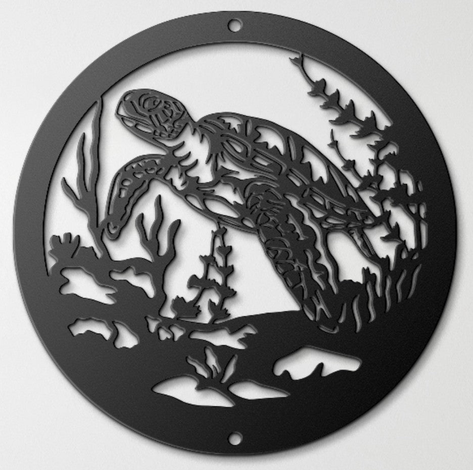 Immerse your space in the beauty of the sea with our Turtle Ocean Scene Metal Wall Art. This intricately designed piece features a majestic sea turtle surrounded by ocean waves, coral, and marine life, creating a stunning tribute to the wonders of the ocean. Whether you're decorating a beach house, coastal retreat, or simply bringing a touch of seaside serenity to your home, this handcrafted sign adds a sophisticated and timeless aquatic charm.